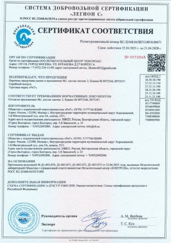 Процессы производства и управления предприятием, принятые в компании РиТ соотвествуют мировым стандартам, о чем свидетельствует сертификат менеджмента качества ISO 9001, полученный нашей компанией в 2020 году.